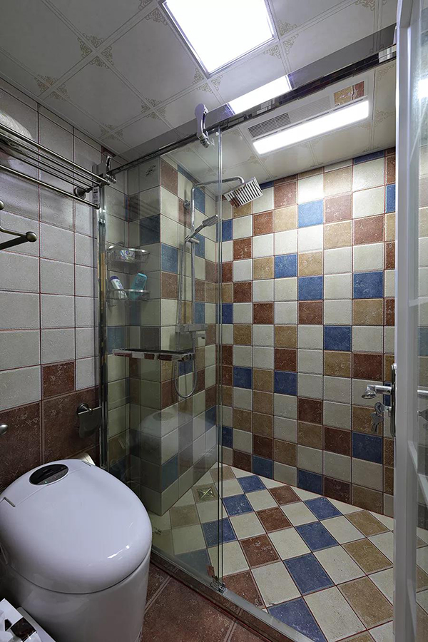 馬賽克瓷磚為淋浴區(qū)增添了田園風,而玻璃推門則表達現(xiàn)代時尚感,色彩斑斕的淋浴區(qū),讓業(yè)主在淋浴時悠閑自得。