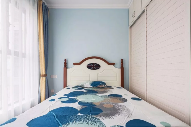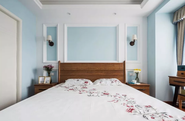 ▲臥室的床頭背景墻以邊框造型,造型內部藍色+四周白色的藍白配,結合對稱的壁燈與床頭柜,整個空間都顯得格外的穩(wěn)重清新。床頭柜上布置著 精致的插花,一本書籍一個茶杯,整個空間都顯得情調而溫馨。
