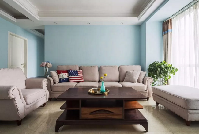 ▲整個開放區(qū)域的墻面都以淡藍色刷新,簡單卻又透著一股自然清新的氣息。一套舒適精致的現(xiàn)代美式布藝沙發(fā),布置在這個寬松的客廳里,顯得格外的舒適自然。
