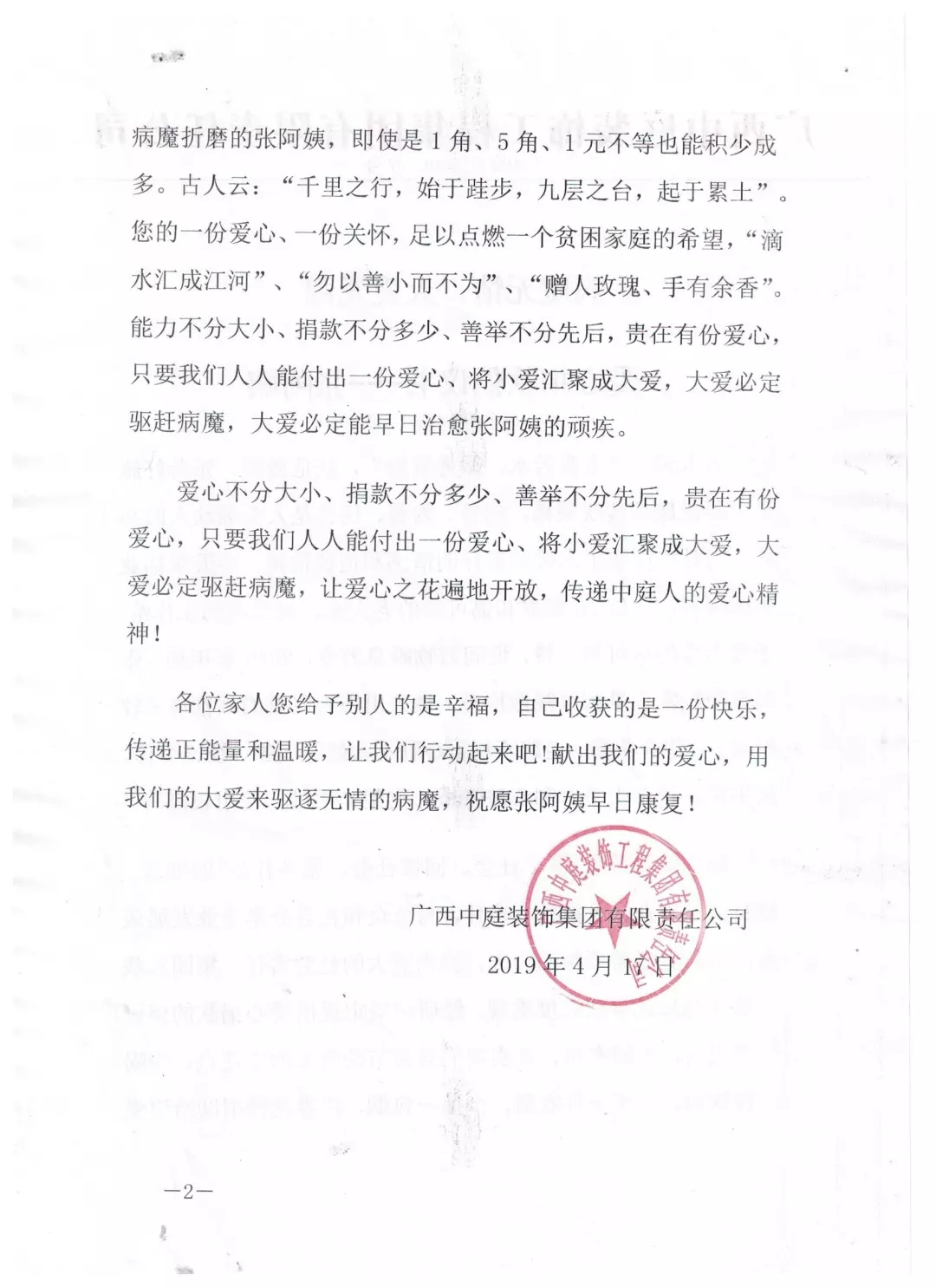 集團(tuán)總裁丁胡先生向全體員工號(hào)召,為張阿姨獻(xiàn)出一份愛心。捐款不分多少,貴在有份愛心,只要我們?nèi)巳硕寄芨冻鲆稽c(diǎn)愛、將小愛匯聚成大愛,大愛必定驅(qū)趕病魔,大愛定能早日治愈張阿姨的疾病。