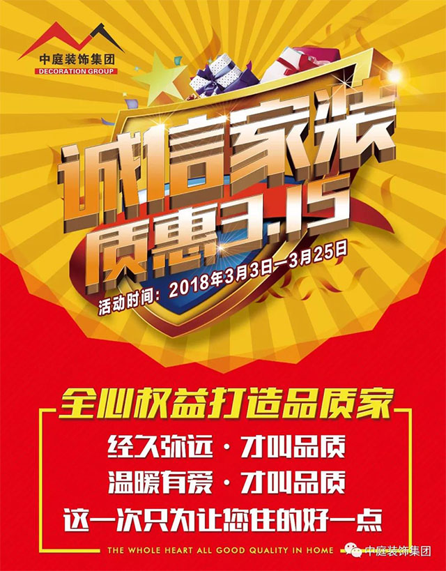 誠信家裝,品質(zhì)宣言,我宣誓:誠信中庭人,從我做起,我愿意遵守公司誠信承諾,以客戶滿意為第一原則,讓百萬家庭享受快樂裝修。誠信315,在消費(fèi)陽光下,中庭裝飾集團(tuán)向您鄭重承諾: