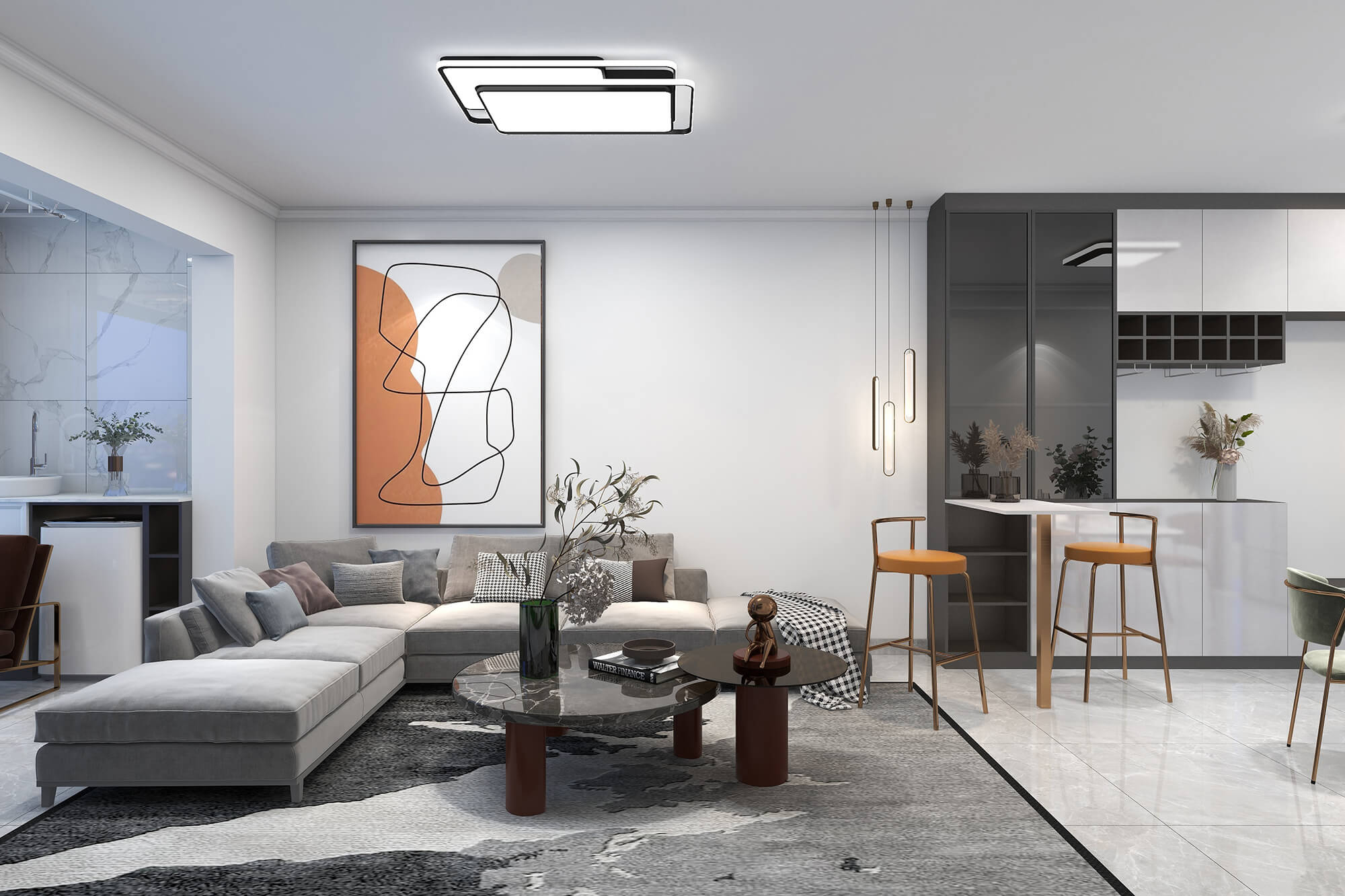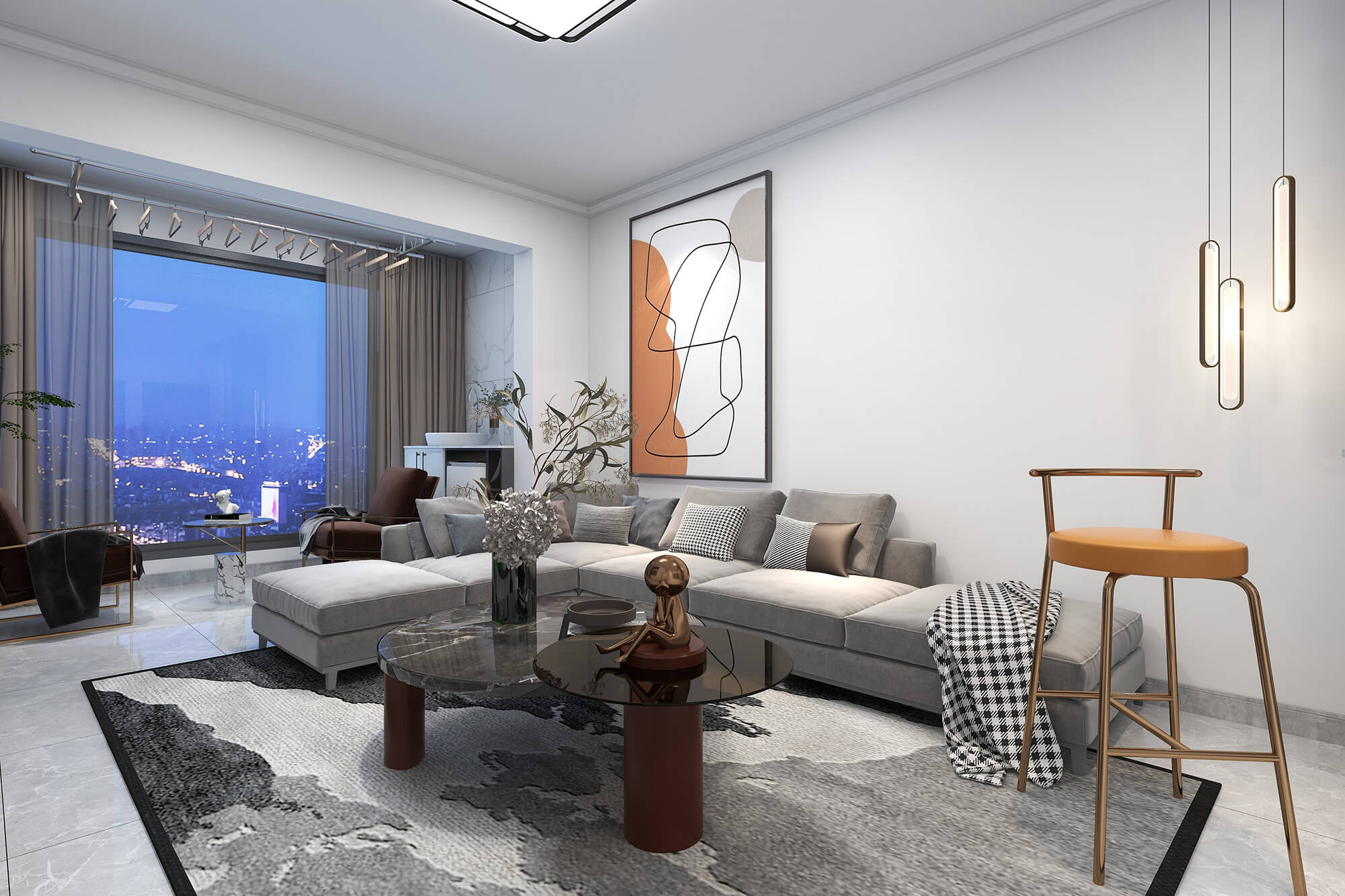本案總面積109㎡,以現(xiàn)代簡約為基底,舒適自然為核心,融合別出心裁的考量,打造精睿格調(diào)、人文藝術(shù)的品質(zhì)居所。為此設(shè)計師在用色選材上大花心思,以溫馨典雅的淺色色、知性優(yōu)雅的咖啡色,璀璨溫暖的橘棕色形成這座大宅獨特的氣質(zhì)色彩,讓人感受到生活的愜意與放松。