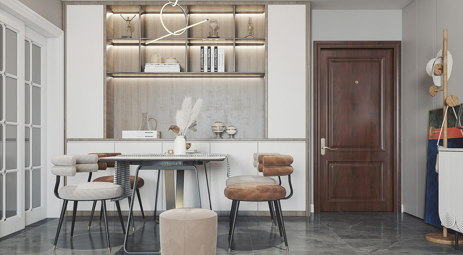 現(xiàn)代輕奢風(fēng)格注重細(xì)節(jié)處理,如用金屬或水晶飾品點(diǎn)綴,營造出高貴典雅的氛圍。整體選用大面積的白色,再選用淺棕色的色調(diào)作為點(diǎn)綴,整體富有質(zhì)感又有生活的溫馨。
