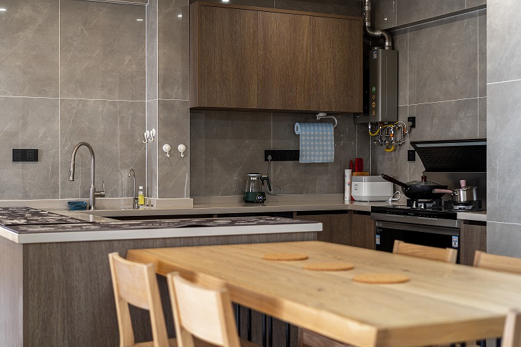 3.廚房:開放式廚房與客廳互為連通又相對(duì)獨(dú)立,中西廚合并與島臺(tái)的設(shè)計(jì)滿足烹飪需求。