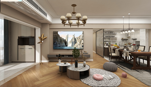 整個(gè)空間基于原宿風(fēng)格上做搭配,客餐廳地面采用兩種材質(zhì),充分把功能性能提高;